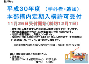 本学では、頻繁に出入構を要する方に対して、事業年度ごとに定期入構許可を行っています。今回、学外の方を対象に、追加で本部構内の定期入構許可証を発行します。構内交通量規制のため駐車場台数内の許可となり、定期入構整理料は月額3,000円です。