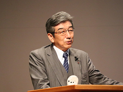「企業力の源泉と産業界が予想する未来”Society 5.0”」と題した講演の中で山西氏は、はじめに三菱電機株式会社の概況紹介をした上で、「世界と日本」という関係ではなく「世界の中の日本」という視点で、経済成長や世界の災害、食糧問題などの社会的課題を解決するソリューションである”Society 5.0”の実現に向け、産業界が果たすべき役割を示しました。また、企業・組織運営に必要なコンプライアンスは「法令遵守」ではなく「倫理遵守」であり、「風通しの良い」組織作りが重要であると述べ、将来を担う経営に必要な視点や、経営者として不可欠な要素について、自身の経験談をもとに語りました。