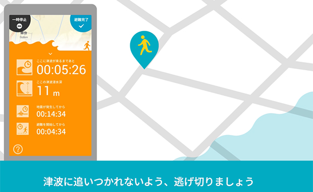 「逃げトレ」は、最新の津波浸水シミュレーションと親しみやすくわかりやすい表現で、津波からの避難訓練をリアルに実施できる避難訓練支援アプリです。「逃げトレ」開発チーム(京都大学防災研究所矢守研究室、株式会社GK京都、R2メディアソリューション、防災科学技術研究所)が、内閣府のSIPプロジェクトの支援を受け開発しました。南海トラフ巨大地震・津波を念頭に置いて、最も重要とされる住民の避難対策に焦点を当て、具体的で切実な問題意識をもったリアルな津波避難訓練を一人一人が、いつでもどこでも実行できる仕組みとして開発を行いました。