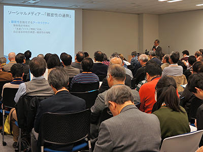 吉田教授は、まず日本におけるソーシャルメディアの利用者数の推移、2004年に日本で初めて開設されたソーシャルメディアの概要、近年よく利用されるサービス内容等について説明しました。次に、このソーシャルメディアでのつながりを社会学的概念の公共圏と親密圏に区分して、どのような関係があるのかmixi、LINE、Facebook等の具体的なサービス内容を例に挙げ、ソーシャルメディアの課題と展望について解説しました。そして、「友人や家族等による具体的な他者の生への関心」によって形成される親密圏と「多様な他者(市民社会)との共通の問題への関心」で形成される公共圏との相互補完的再構築がソーシャルメディアにおけるつながりには重要であることを社会理論を交えて言及しました。
