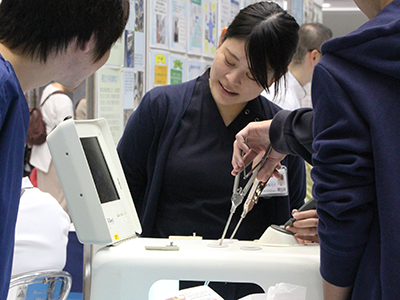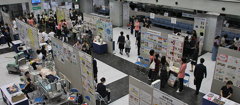 各診療科(部)の取り組みを紹介する「パネル展示」では、業務内容や取り組み、器具の展示や取り扱いについて職員が説明し、来場者に現場での活動を知ってもらう機会を提供しました。また、疾患栄養治療部のインボディーによるメタボチェックや看護部のハンドマッサージなどの「体験コーナー」、さらに医学部附属病院への就職希望者を対象にした「就職相談コーナー」や「見学ツアー」など様々な企画を実施しました。イベントには将来医療の道を志す人から近隣住民までたくさんの参加があり、盛況のうちに終了しました。