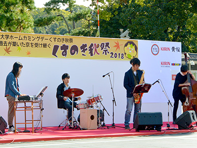 百周年時計台記念館前広場のクスノキを中心に展開した「くすのき秋祭2018」では、本学の現役学生がメンバーでもある、京都出身の6人組バンド「Qyoto」による演奏をはじめ、数々のパフォーマンスが繰り広げられました。