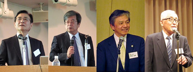 左から、講演を行う湊理事・副学長、矢田部特命教授、司会を行う宇野幹事、挨拶を行う中越会長