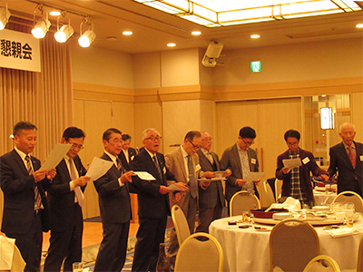 引き続き行われた懇親会では、宇野英満 幹事(理学部・1980年卒)の進行のもと、参加者全員で京都大学学歌「九重に花ぞ匂へる」の斉唱で開宴され、その後、湊理事・副学長の乾杯の発声で、和やかな雰囲気の中、会員相互の交流が深められました。最後に「琵琶湖周航の歌」の合唱が行われ、次回幹事である矢田部特命教授の挨拶をもって、盛況のうちに閉会となりました。今回は日程等の関係から、参加者が少なかったものの、若い会員の方が多く、今までの総会・懇親会とはまた違った雰囲気の会となりました。