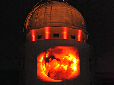 昨年までの本コンサートでは、「古事記と宇宙」の映像を、花山天文台本館の壁に直接、プロジェクションマッピングのように投影していました。しかし、今年は、少しでもより美しい映像を上映したいという喜多郎氏の意向により、壁面を包む野外コンサート用のスクリーンが、同氏の手作りにて用意されました。そのおかげで、同天文台本館ドーム窓枠の影響を受けることなく映像を上映することができました。聴衆は、喜多郎氏の感動的なライブ演奏を聴きながら、美しい宇宙天体の映像・画像の数々に酔いしれていました。