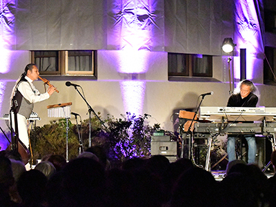 コンサートの前半には、昨年のコンサートに友情出演された音楽家の岡野弘幹氏が応援に駆けつけ、喜多郎氏のシンセサイザーに合わせて岡野氏の笛やギターが演奏されるなど、二人の見事に息の合った共演が披露されました。驚くことに、リハーサル時とは全く異なった音楽となっており、両演者は作曲しながら演奏されていたとのことです。