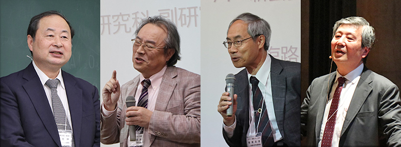 左から、挨拶をする中村会長、現状報告をする椹木副研究科長、挨拶をする塩路名誉教授、講演をする浅田教授
