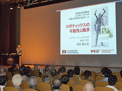 引き続き同ホールにて講演会が行われ、浅田春比古 マサチューセッツ工科大学教授(工学部・1973年卒)による「ロボティクスの可能性と限界」と題した講演がありました。ロボティクスの研究分野が発展し、暮しや将来の社会の在り方まで影響を及ぼすようになった現状や、今後の飛躍・進展の可能性、課題・限界について、マサチューセッツ工科大学で開発されたユニークなロボットが紹介されました。