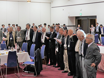 その後会場を国際交流ホールに移し、はじめに京機会活動において顕著に活躍した会員5名と1組への表彰が行われました。続いて行われた懇親会は、新会長となった塩路名誉教授による挨拶の後、出席者最年長の下間頼一氏(工学部・1950年卒)による乾杯の発声で始まりました。大いに盛り上がる中、終盤では恒例の「琵琶湖周航の歌」を参加者全員で合唱しました。最後に杉江俊治 副会長(工学部・1976年卒)よる挨拶があり、懇親会は盛況のうちに終了しました。