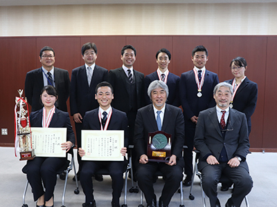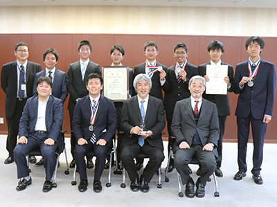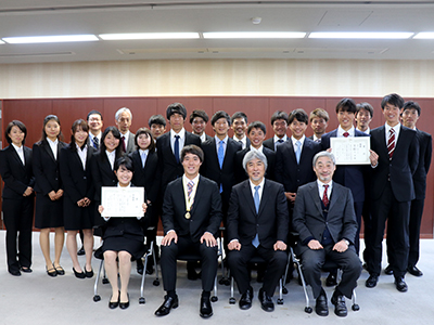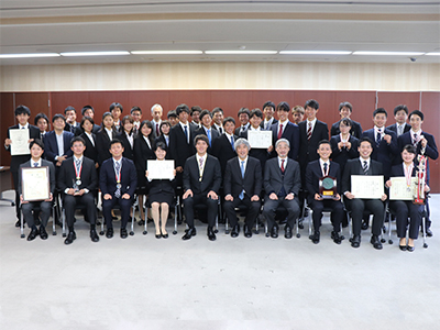 表敬訪問には、京都大学体育会ヨット部部員7名と増田開 部長(エネルギー理工学研究所准教授)及び入口朋昌 監督(施設部主任)、体育会男子ラクロス部員20名と村上章 部長(農学研究科教授)、体育会居合道部員6名と下田宏 部長(エネルギー科学研究科教授)が出席しました。