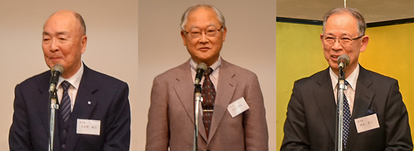 左から挨拶をする日比野世話人代表、津川来年度評議員・世話人代表、乾杯の挨拶をする熊谷氏