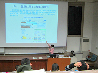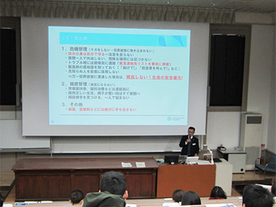 阪上優 健康科学センター准教授が海外生活において健康面で留意する事柄や必要な対策について講義し、株式会社東海日動パートナーズかんさい京都支店の高橋健二郎氏が安全面について、海外で実際に起きた事例を基に、起こりうるトラブルとその対策について講義を行いました。