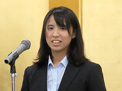 表彰状および副賞の授与の後、平岡さん、木谷さんより、受賞に至った自らの夢についての発表がありました。平岡さんは「キルギス氷河地帯の水収支をモデル化し、地球温暖化に伴う世界の水不足の解決につなげたい。過酷な環境での現地調査も、女性であっても臆せず取り組みたい。」と話しました。また木谷さんは「いまだ途上国では感染症で亡くなる人が後を絶たない。現地調査を行い、社会的な面も考慮したうえで感染症や薬剤耐性菌についての解決方法を探っていきたい。」と話しました。