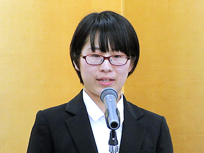 その後、2017年度受賞者2名から、今年度の成果、活躍について報告がありました。飛田美和さん(工学研究科修士1年生)は「執筆した論文2本が相次いで高く評価された。また留学生グループ来日時に通訳を務め、刺激を受けた。現在、本来の夢である回転機の設計理論確立に向けて進んでいる。」と話しました。岩上真子さん(工学研究科修士1年生)は「光エネルギーを利用するために用いる光触媒の設計に取り組み、研究者としての基礎能力を養うことができた。次世代型エネルギーについて提案できるオリジナリティを持った人材を目指したい。」と話しました。