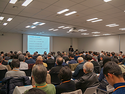 奈良岡教授は、大政奉還、王政復古の大号令等歴史上の出来事を紹介しながら、明治維新とは何かについて講演を行い、過去に実施された明治維新の周年記念事業(明治50年、60年、100年、150年)のなかで、どのような行事が政府主催、あるいは地方、民間主催で行われたのか、またその時代背景について、当時の討幕派・旧幕府勢力の思想や、時代の世相(世論調査等)を交えながら解説しました。