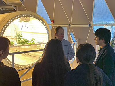 総合生存学館および宇宙総合学研究ユニットと米アリゾナ大学は、世界初の閉鎖環境施設「バイオスフィア2」(B2)を用いた第1回有人宇宙実習「スペースキャンプ・バイオスフィア2」 ( SCB2) を実施しました。本学からは山敷庸亮 総合生存学館教授、土井隆雄 宇宙総合学研究ユニット特定教授、寺田昌弘 同特定准教授および三木健司さん( 農学研究科博士後期課程2回生) 、星之内菜生さん( 工学部3回生 )、坂東日菜さん ( 理学部2回生)の学生3名が 参加しました。