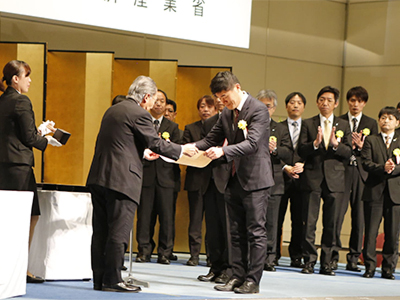 表彰式で表彰状を受け取る丸山特定助教