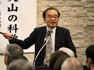 講演会では、まず、稲葉カヨ 理事・副学長が本学を代表して開会の挨拶を行い、鹿児島で開催する運びとなったことに謝意を述べました。その後の講演では、井口正人 防災研究所教授が、桜島の噴火活動は「おとなしくないが、極めて教科書的」とし、桜島の噴火活動を例に火山に関する基礎について解説をしました。講演会には249名の参加があり、鹿児島在住者の目線での井口教授の講演に、参加者からは多くの質問が寄せられ、本学の研究活動の一端に触れる機会となりました。