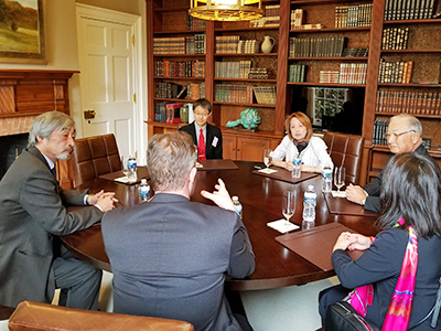 本学ワシントンDC京大会(DC同窓会)との懇談では、同窓会との連携の強化及び北米地域での京都大学ネットワークの構築・強化に向けた方策について議論を行ないました。また、在アメリカ合衆国日本国大使館では、留学生派遣・受入数の増加に向けた情報発信のあり方、関係機関・大学へのアプローチ方法や本学の留学制度のあり方等、具体的な取り組みの実施可能性について活発な意見交換を行いました。