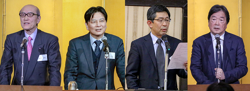 左より開会挨拶をする出口代表幹事、挨拶をする徳賀副学長、司会をする能勢幹事、講演をする田中理事長