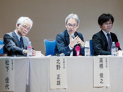 シンポジウムの様子(左から北野理事・副学長、高橋特任准教授、山田准教授)