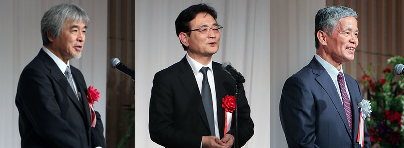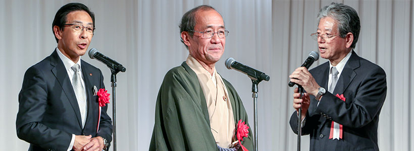 左から、祝辞を述べる西脇京都府知事、門川京都市長、里見日本学術振興会理事長