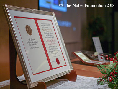 会場には、スウェーデンでの授賞式にてグスタフ国王から本庶特別教授に手渡されたノーベル賞のメダル、賞状とノーベル生理学・医学賞受賞者のノーベル財団公式ポスターを展示し、また、2018年10月1日の受賞者発表の瞬間から授賞式、本学での行事等の本庶特別教授の動向を追ったスライドショーを上映しました。