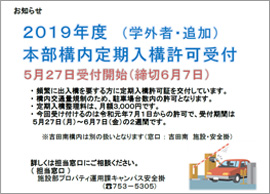 本学では、頻繁に出入構を要する方に対して、事業年度ごとに定期入構許可を行っています。今回、学外の方を対象に、追加で本部構内の定期入構許可証を発行します。構内交通量規制のため駐車場台数内の許可となり、定期入構整理料は月額3,000円です。