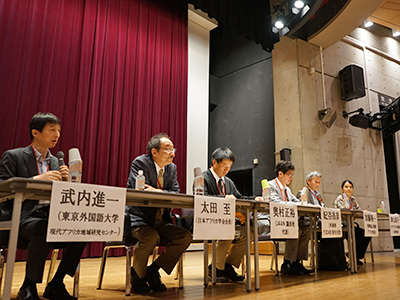 シンポジウムの後半では、外務省、JICA、NGOでアフリカに関わる実務家とともに、日本のアフリカ研究の特長や課題、今後の方向性について協議するパネルディスカッションが行われました。日本アフリカ学会の会長でもある太田名誉教授は、同会の研究者がアフリカを理解するための研究やアフリカから学ぶことに問題意識を持ってきた半面、実務者との協働が十分でなかった点を指摘しました。