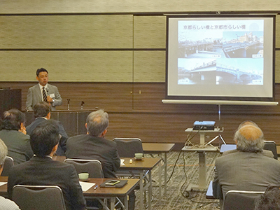 本学からは、髙橋良和 工学研究科教授と髙井敦史 地球環境学堂准教授が参加しました。総会前には、髙橋教授が、本学創生期の土木工学出身者による京都市の都市建設への貢献などを紹介する「戦前の京都大学土木と都市建設の系譜 ~京都市を例として~」と題した講演を行いました。