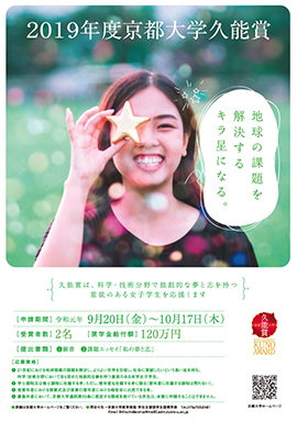 京都大学久能賞は、京都大学OGの久能和子氏(工学部1975(昭和50)年卒)、祐子氏(同1977(昭和52)年卒)のお母さまである久能悠子氏からのご寄附により設立されました。悠子氏は、ご自身の学生時代に、科学の道へ進みたいとの思いを抱いていましたが、その夢は戦争によって叶いませんでした。久能賞には、悠子氏のお二人のご令嬢が京都大学の女子学生として素晴らしい教育を受けることが出来たという感謝の思いと、悠子氏の叶えられなかった夢を今の若い世代の方々に託したいという二つの思いが込められています。