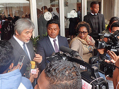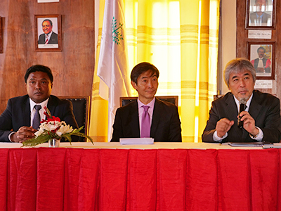 調印式は、ラヴェルマナナ学長からの歓迎の挨拶で幕を開けました。その後、アンタナナリヴ大学と本学の架け橋的存在としてこれまで重要な役割を果たしてきたH. ラクトゥマナナ(Rakotomanana) アンタナナリヴ大学 理学部教授からもMOU締結に至る経緯の詳細な説明があり、今回の調印を契機とした今後の両大学の学術交流の進展に期待を寄せました。その後、小笠原大使を始めとする出席者一同が見守るなか、ラヴェルマナナ学長と山極総長がMOU文書に署名し、このたびの調印が完了しました。