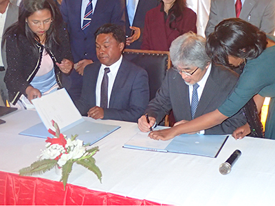 本学は、マダガスカルのアンタナナリヴ大学と大学間学術交流協定(MOU)を締結しました。アンタナナリヴ大学は、マダガスカル共和国の首都に位置する同国最大の国立総合大学です。2018年にはすでに本学の複数部局との間で交流協定が結ばれていましたが、双方の研究者および学生の学術交流を一層加速させるべく、このたび、山極壽一 総長や森哲 理学研究科准教授、佐藤宏樹 アフリカ地域研究資料センター助教らがアンタナナリヴ大学を訪問しMOUを締結しました。アンタナナリヴ大学からは、M. R. ラヴェルマナナ(Ravelomanana) 同学長を含む教職員一同が、また、在マダガスカル日本国大使館からは小笠原一郎 同特命全権大使が臨席しました。