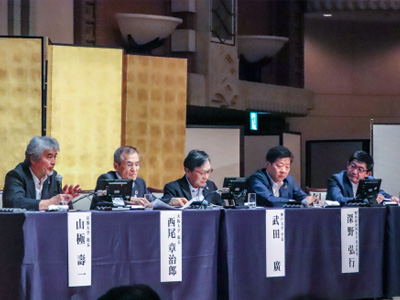 パネル討論の様子(左から山極総長、西尾総長、武田学長、深野代表幹事、竹田社長)