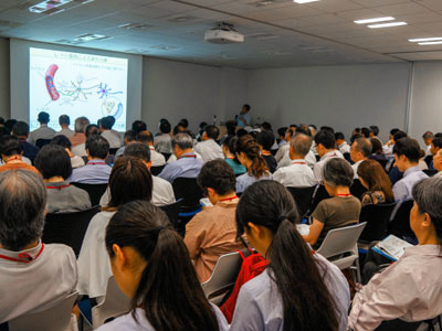 高橋教授は、まず人間の細胞には再生する細胞と再生しない細胞があるが、再生しない細胞についてもiPS細胞を用いて修復できる可能性を秘めていることを解説しました。次にパーキンソン病の原因について、中脳黒質のドパミン神経細胞の減少が根本的な原因であると説明し、現在治験段階中のiPS細胞を用いたパーキンソン病治療法である「定位的脳手術による細胞移植」についてイラストを用いて紹介しました。そして最後に、iPS細胞を用いた再生医療は投薬治療やリハビリテーションなどと共同で治療を行うことでより効果を上げることができると解説しました。