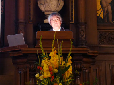 式典はセレモニ-とレセプションの二部構成で行われ、第一部のセレモニ-はハイデルベルク大学の講堂 Alte Aulaにおいて行われました。山極壽一 総長は開会挨拶のなかで京都と欧州を繋ぐ「窓」としての全学海外拠点の役割について触れ、続くBernhard Eitel ハイデルベルク大学長も、祝辞のなかで山極総長の挨拶を受けて「窓」に言及し、欧州拠点のもつ役割の重要性を述べました。