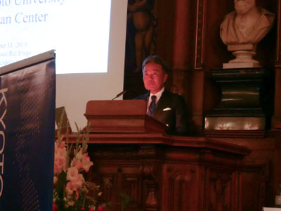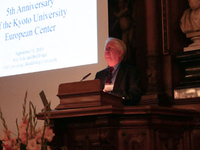 また、本学同窓生より、京都大学鼎会の森雅彦 DMG森精機株式会社代表取締役社長が、欧州に大きな基盤を持つ産業界の視点から祝辞を述べ、欧州洛友会の清水健太郎 チューリッヒ大学教授が、自身の経験や研究内容を踏まえた研究の国際化について、基調講演を行いました。