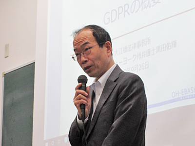 講演会は、GDPR対応に精通している実務家の黒田佑輝 弁護士(弁護士法人大江橋法律事務所所属)を講師に迎え、谷川徹 総務部法務室長による司会のもと、森田正信 理事の挨拶で始まりました。黒田弁護士によるGDPRの具体的制度内容や、本学の業務内容に沿った保有個人情報の取扱い運用上のポイント等の解説を行いました。