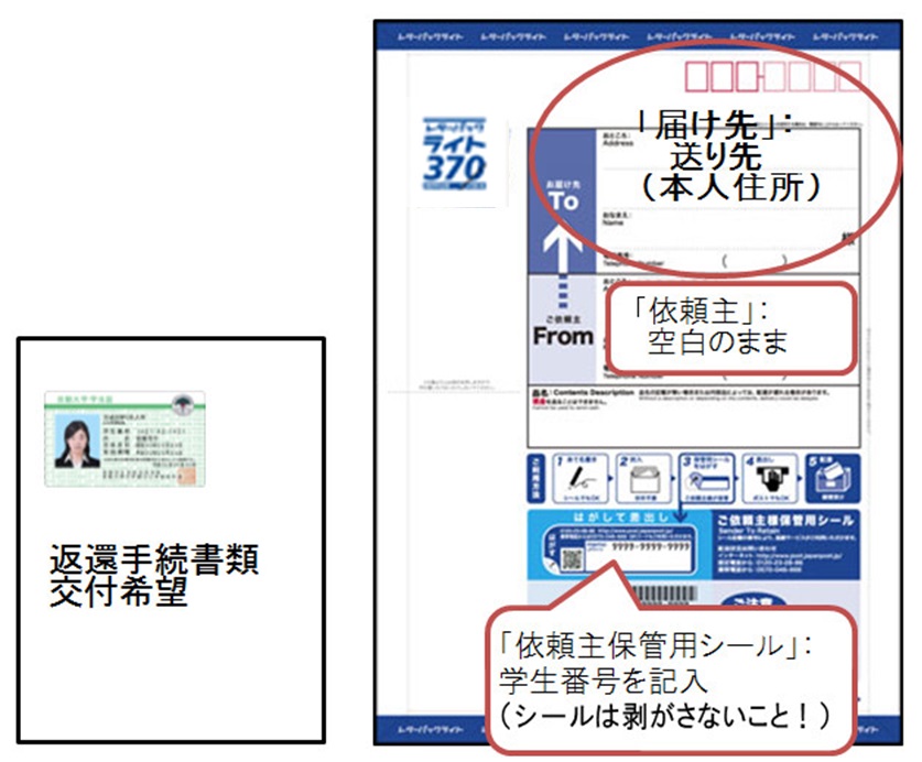 「レターパックライト」(時計台生協ショップ、郵便局、コンビニエンスストア等で購入できます)に必要事項を記入し、「学生証」をコピーしたA4用紙 (余白に「返還手続書類交付希望」と記入)を添付のうえ、学生課奨学掛まで郵送してください。