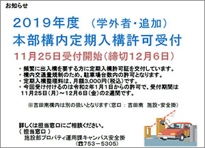 本学では、頻繁に出入構を要する方に対して、事業年度ごとに定期入構許可を行っています。今回、学外の方を対象に、追加で本部構内の定期入構許可証を発行します。構内交通量規制のため駐車場台数内の許可となり、定期入構整理料は月額3,000円(税込)です。
