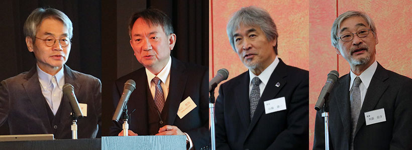 左から、林名誉教授、杉江名誉教授、山極総長、川添理事・副学長