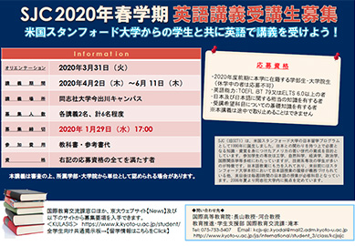 スタンフォード日本センターStanford Japan Center(SJC)が提供する英語講義の受講を希望する本学の学生を募集します。文系理系を問わず応募可能です。