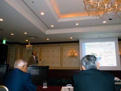 矢田部龍一 幹事(工学部・1976年卒)の司会のもと、中越眞 会長(法学部・1967年卒)が開会挨拶を行い、続いて、荒木茂 総長特別補佐が特別講演「アフリカ焼畑研究30年」と本学の現状と展望について報告を行い、武岡英隆 愛媛大学南予水産研究センター長(理学部・1974年卒)の特別講演「南予水産研究センターの活動」が行われました。
