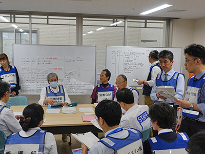 災害対策本部においては、災害対策本部長である宮本享 医学部附属病院長の指揮の下、各病棟等から提出される発災時報告書やチェックリストの収集および整理、院内外被災情報の収集、要解決事項や要請事項に対する対応の検討、各エリアの担当と関連部署間の連絡や調整、EMIS(広域災害医療情報システム)入力、空床の確認、医薬品の在庫確認および国立大学病院災害対応バックアップシステムの運用、安否確認/登院可否報告メールの運用訓練等を行いました。