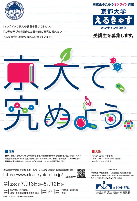 13期目を迎えた今年度は新型コロナウイルス感染症の拡大防止のため、「京都大学『えるきゃす』オンライン2020」として、理系15分野、文系3分野の計18講座をオンラインにて開講します。