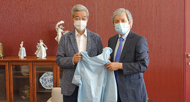 特注医療用ガウンの寄贈の様子(左から塚本代表取締役会長、宮本病院長)