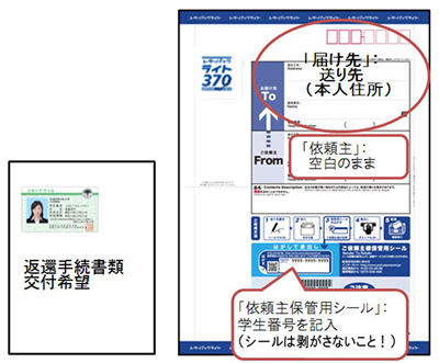 「学生証」をコピーしたA4用紙 (余白に「返還手続書類交付希望」と記入すること)