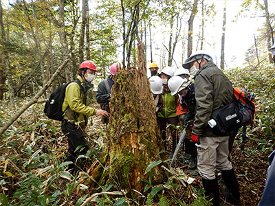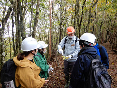 このイベントは、本施設の存在および意義、教育・研究内容を地域を中心とした一般市民の方々に知ってもらうことを目的に2015年から開催しているものです。当日は、有田川町清水行政局駐車場に集合し、マイクロバスで林内に向かいました。現地では研究林教員および技術職員の解説により、主に標高の高い尾根部で自然観察を行いました。参加者は樹木の種名だけでなく、その生息地など生存戦略の多様性や、木材の資源としての利用と課題に関して理解を深めました。