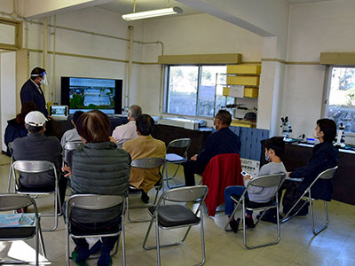 このイベントは地すべりの多発する四国の地形や地質を知ってもらうことを目的に、防災研究所・斜面災害研究センターが毎年開催しているものです。例年はバスに乗り、ジオサイトの見学を行っていますが、2020年は一般公開のみを実施しました。それでも徳島県内外から、31名の参加があり、4回に分けて観測所の研究活動や地すべりに関する講義や展示の紹介を行いました。展示室では触ることのできる岩石鉱物の標本や、驚くほど精密な立体地図、最先端の調査機器、実際の調査の様子を収めたビデオを6台のディスプレイで上映し、触って見て感じる展示を行いました。多くの参加者から質問があり、イベントは好評のうちに終了しました。