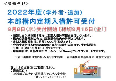 本学では、頻繁に出入構を要する方に対して、事業年度ごとに定期入構許可を行っています。今回、学外の方を対象に、追加で本部構内の定期入構許可証を発行します。構内交通量規制のため、駐車場台数内の許可となり、定期入構整理料は月額3,000円(税込)です。